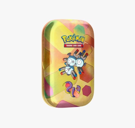 Each mini tin comes with two booster packs, a metallic Pokémon coin, and “a Pokémon art card showing the art from this Mini Tin — you can collect and combine all ten!”