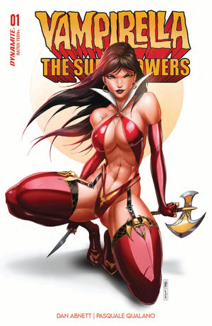 It's full-throttle throwback action, courtesy of superstar writer Dan Abnett (Avengers, Warhammer) and red-hot artist Pasquale Qualano (DC Vs. Vampires)! Vampirella and her trusty sidekick Dyna Might have become superheroes, and are assigned to save a world that looks strangely similar to 1940s Earth, rife with crime and corruption, and two-fisted superheroes who don't take kindly to meddling from interdimensional vampire aliens! Can Vampirella survive an onslaught of conflict from villains and heroes alike, all while solving a murder mystery and keeping her precocious sidekick alive?