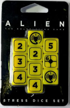 A set of ten engraved Stress Dice, designed specifically for the ALIEN Roleplaying Game. These 16 mm special dice are designed to support the game mechanics but can be used as normal six-sided dice as well.