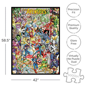 🧩 5000 PIECE JIGSAW PUZZLE: Enjoy piecing together this 5000 piece puzzle featuring the artwork of famed Marvel artist, Dusty Abell who’s managed to capture the 60 years of Avengers in this beautifully illustrated puzzle. It comes in a deluxe box and includes a velvet bag for the pieces and a character key poster so you identify everything Avengers.