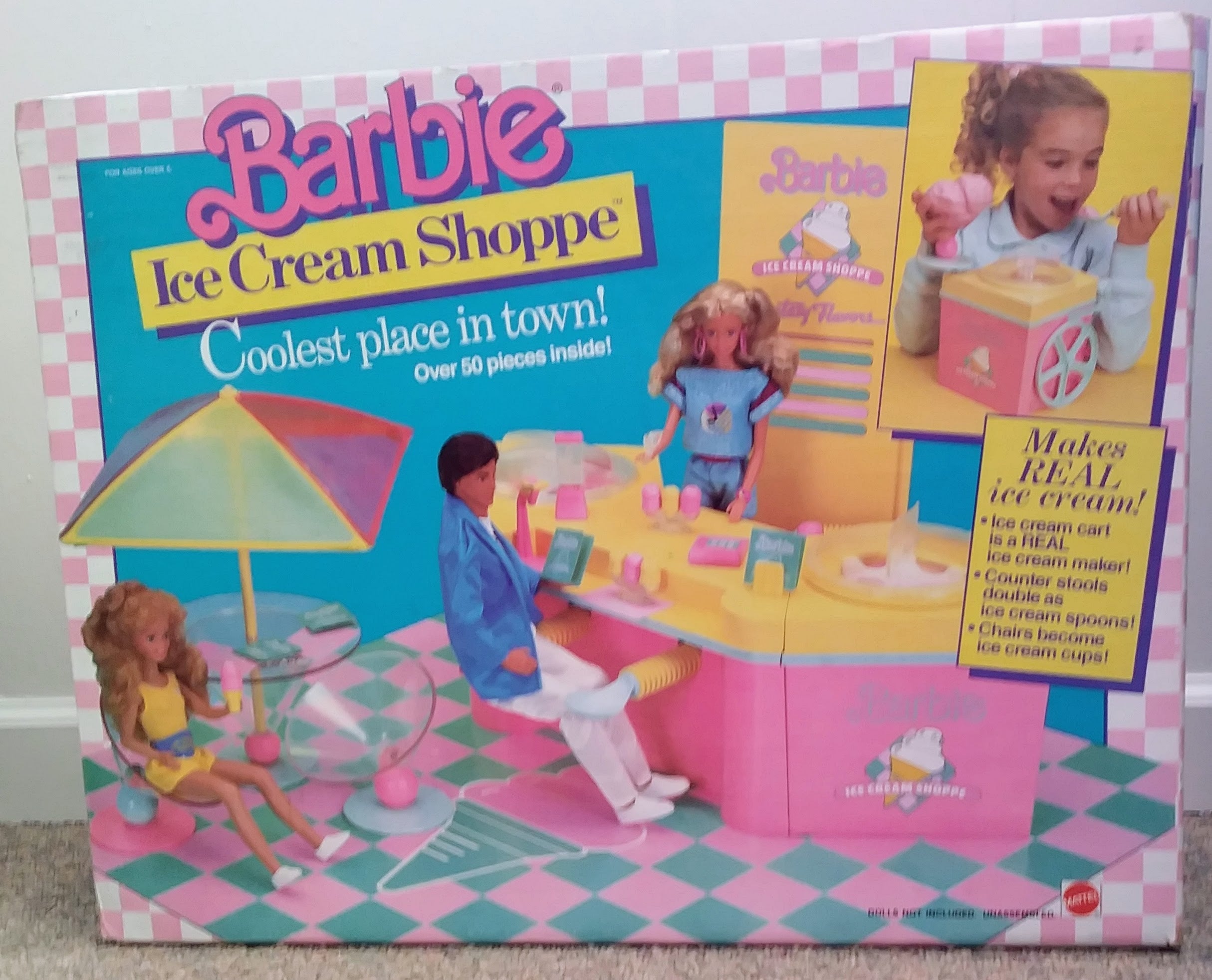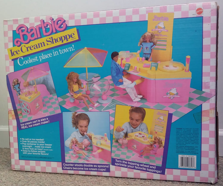 1987 Barbie Playset - Barbie Ice Cream Shoppe. Complete in original box. In excellent shape, stickers complete and fully intact. Includes all accessories plus 3 extra menus.