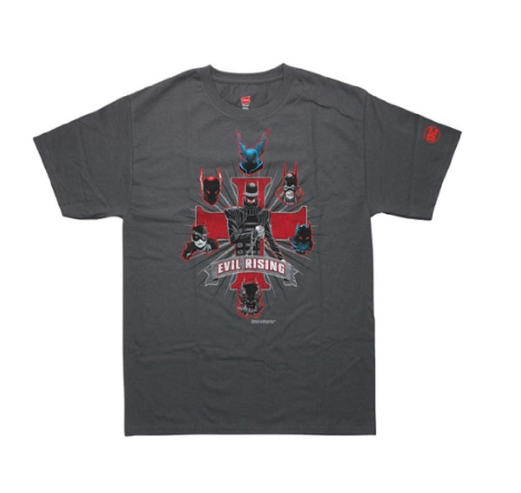 Batman Dark Nights Metal Evil Rising T-Shirt Explore the Dark Multiverse wearing this cool Batman t shirt! The Batman Dark Nights Metal Evil Rising T-Shirt is gray. Inspired by the DC Comics miniseries Dark Nights: Metal, it features a red cross and a starburst with the words "Evil Rising" and images of the seven "nightmare" Dark Knights from alternate realms including The Batman Who Laughs, The Merciless, The Dawnbreaker, The Murder Machine, The Devastator, The Drowned and The Red Death!