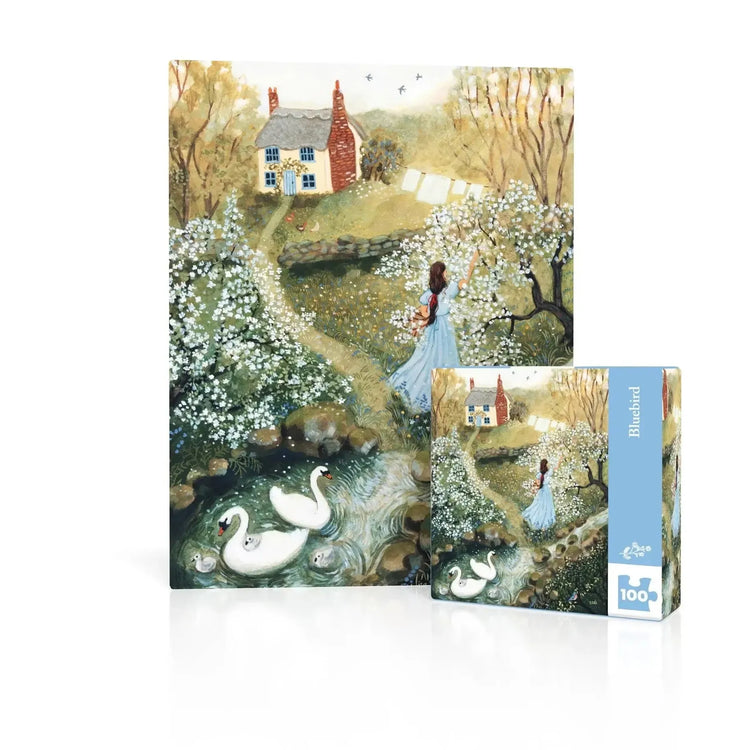 Bring a touch of nature’s charm into your day with the "Bluebird" 100 Piece Mini Puzzle. This enchanting scene, illustrated by Loré Pemberton, captures a tranquil countryside moment. A young woman in a flowing blue dress reaches for a flowering tree branch in a blooming spring garden. Nearby, a pair of elegant swans glide across a gentle stream, accompanied by their fluffy cygnets. A quaint cottage nestled among lush greenery, with laundry drying in the sun, adds to the idyllic charm, while a vibrant bluebird perched nearby completes the serene tableau.