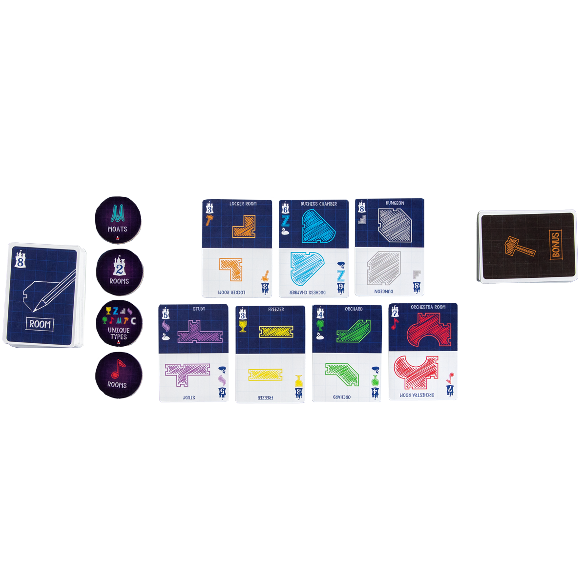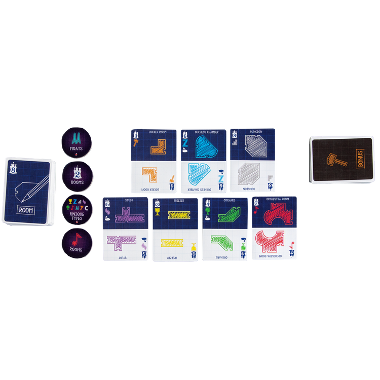 If you love Castles of Mad King Ludwig, hearken and take note! Blueprints of Mad King Ludwig brings even more customization to its tile laying sibling. The room completion bonuses allow you to move doors, add secret doors, and even remove doors entirely allowing for a cascading chain of beneficial bonuses. Are you having a hard time envisioning just how a room will fit in your castle? Thanks to the vellum sketch pad, simply slide the room card underneath and you can see exactly how it fits in your grand design!