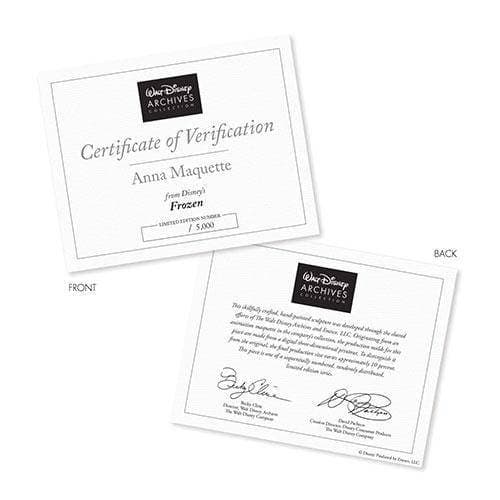 The original animation maquette in the company's collection was unpainted and did not include Anna's signature cape. For this limited-edition reproduction, a sculpted cape was added under the supervision of Disney’s “Frozen” art director.