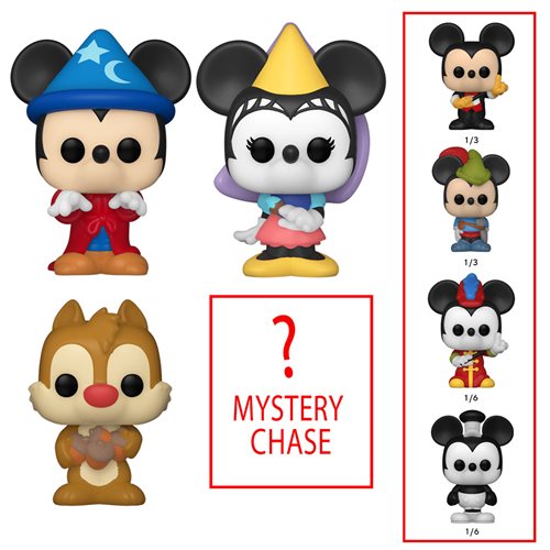 The Disney Classics Mickey Mouse Bitty Pop! Mini-Figure 4-Pack includes 1x Mickey Mouse, 1x Minnie Mouse, 1x Pluto Bitty Pop!, and one will be a surprise chase figure!