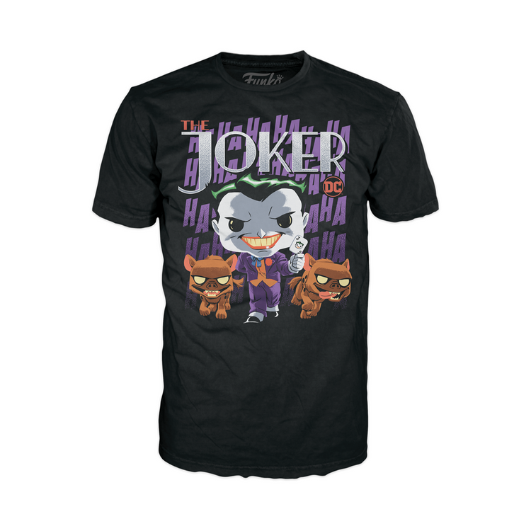 Stack the deck with plenty of laughs with this DC Comics Joker™ Boxed Tee. On the front of this black crewneck tee, Joker flashes his smile—and the joker card. His hyenas, Bud and Lou, are by his side—for a few more laughs. In the background, the text Ha Ha Ha erupts in purple all around Pop! Joker.