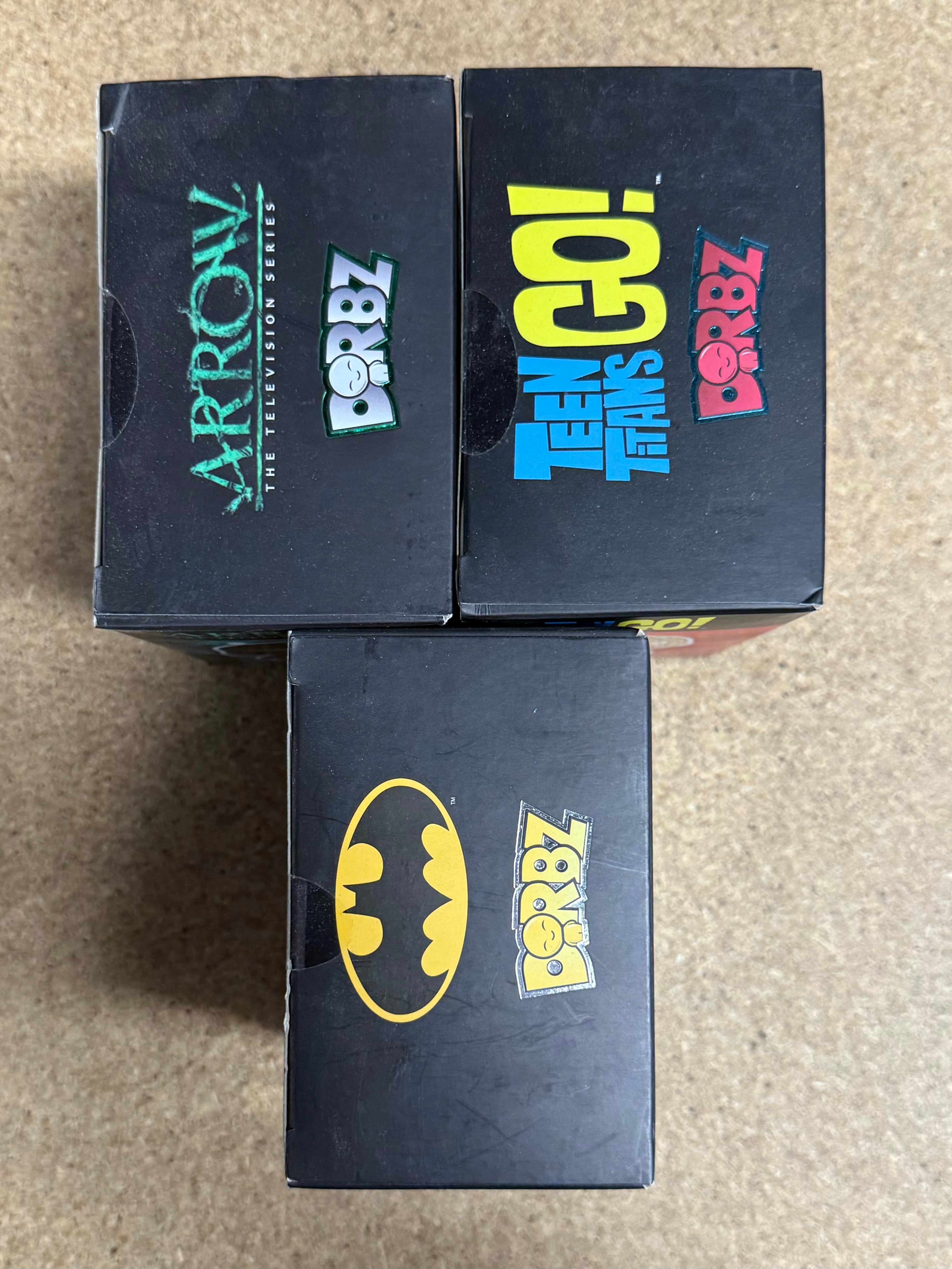 This exclusive lot of 3 Funko Dorbz figures features Malcolm Merlyn, Batman, and Robin from the DC Universe. The vinyl figures are unopened and come in their original packaging. The characters are part of the Dorbz collection and are highly sought after by collectors.