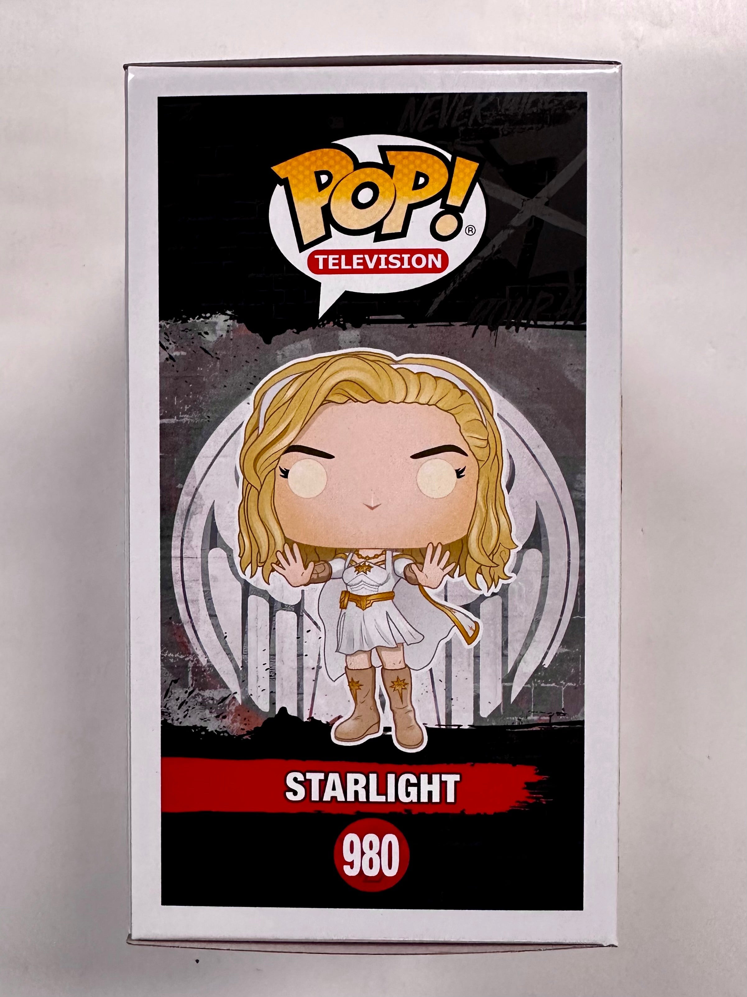 This Funko Pop! Television figure features the character Starlight from the popular TV show The Boys. It comes in its original, unopened packaging and includes a protector. The vinyl figure stands at a standard size and belongs to the Pop! product line by Funko.
