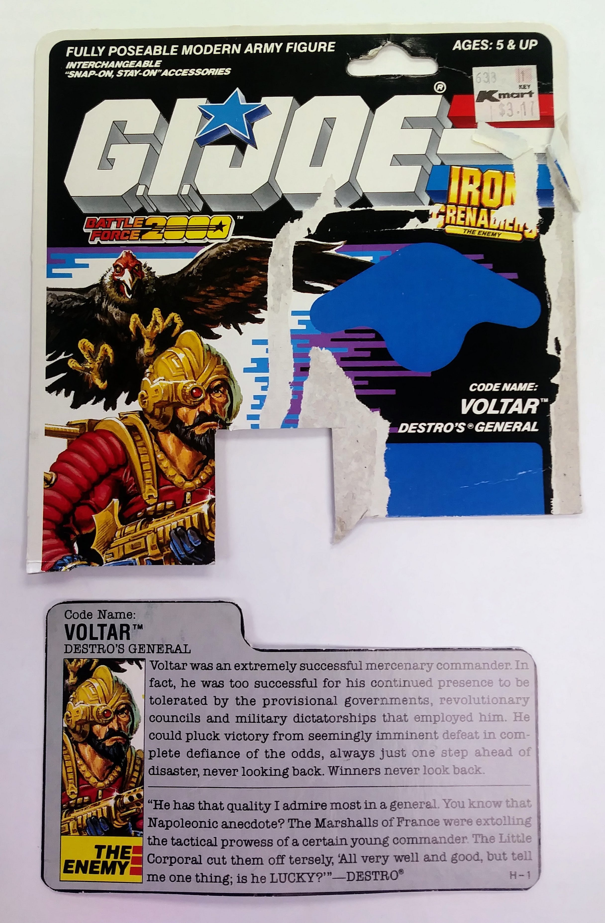1988 COBRA action figure from Hasbro - Voltar (Destro's General) from Destro's Iron Grenadiers. Loose, includes original file card and figure card. Broken O-ring, needs repair.