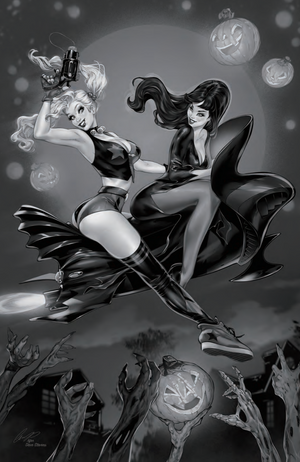 THE MISTRESS OF THE DARK MEETS DADDY’S LITTLE MONSTER! What happens when the Clown Princess of Crime gets bored? Shenanigans- hijinks- grievous bodily harm… the possibilities are endless! Now add in a certain macabre-minded TV host who seems to attract trouble like crypts attract vampires- and the stage is set for the greatest team-up since Frankenstein met his Bride! With her beloved show on the chopping block following a corporate takeover- Elvira needs to come up with a plan to get things back in the black — and her new friend Harley Quinn has an idea that’s just crazy enough to work! Together- they’re going to throw the greatest Halloween party Brooklyn has ever seen — whether the borough likes it or not! Written by AMANDA CONNER and JIMMY PALMIOTTI — the world-famous tag-team of all things Harley Quinn — this crossover event for the ages from Dynamite and DC Comics also showcases Amanda’s fan-favorite artistic chops- with each issue featuring two (count ’em- two) Conner covers. And that’s not all (certainly not!) — she’s also joining interior artist (and Elvira favorite) JUAN SAMU to provide selected story pages for the series! But wait- there’s more! This premier issue also includes darkly captivating covers from JOSEPH MICHAEL LINSNER- CHAD HARDIN- BEN CALDWELL- and best-selling Mark Spears Monsters creator MARK SPEARS!