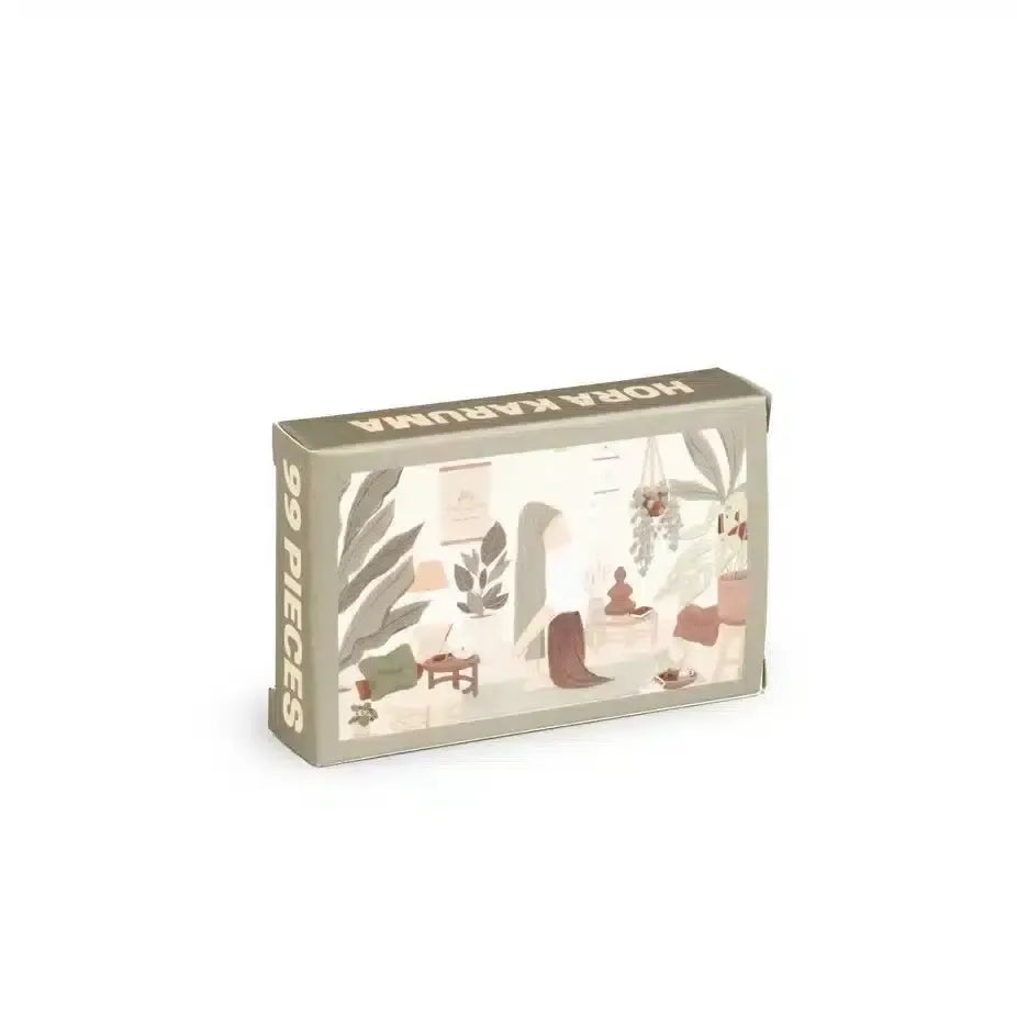 Trevell's Hora Karuma mini puzzle is a 99-piece mini puzzle . It's illustrated by Atelierlaminedor . This illustration is an invitation to take some time for yourself, breathe in and out, and let's go for a yoga session at home.