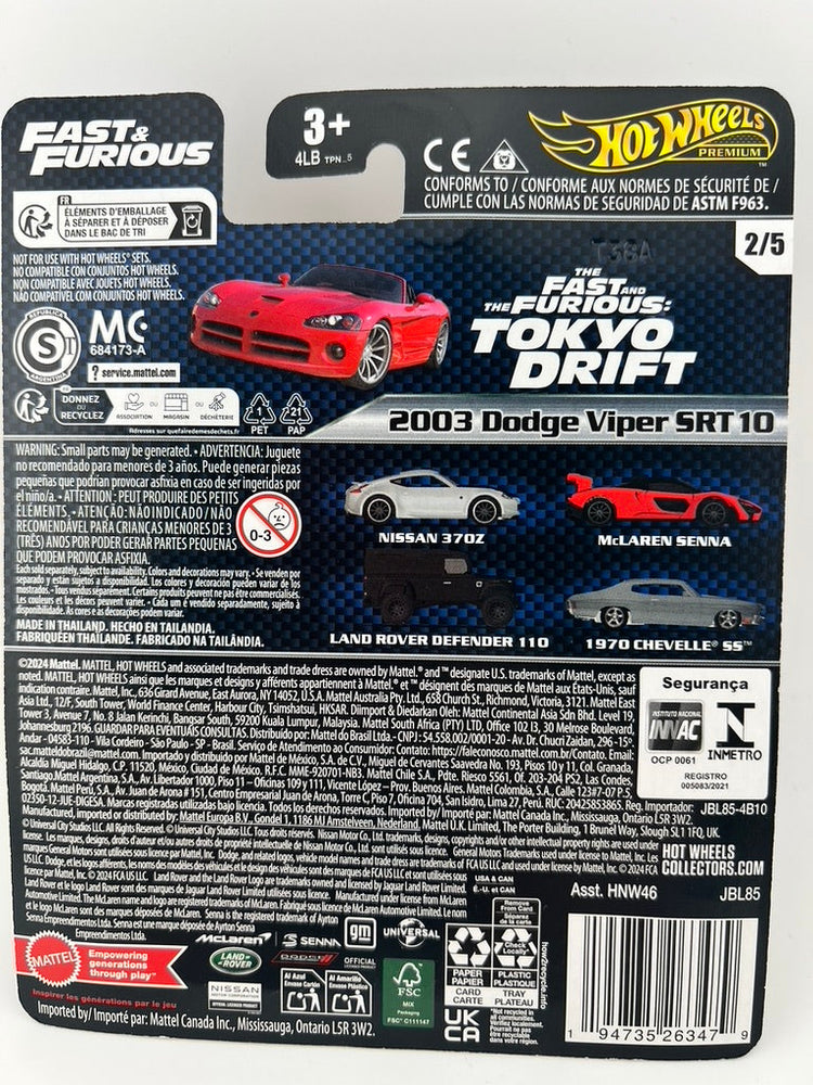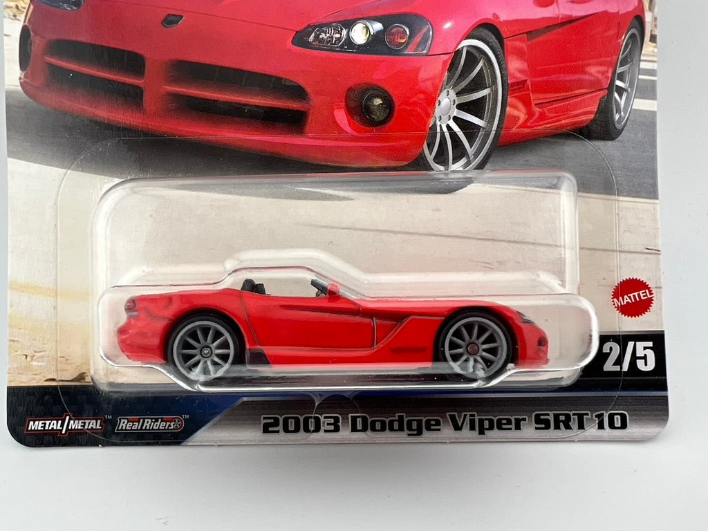 The 2003 Dodge Viper SRT10 is a pure American supercar, and this Hot Wheels Premium edition from the Fast & Furious line brings its raw power to collectors. Dressed in striking red with black interior, this casting replicates the aggressive stance and unmistakable curves of the Viper roadster.