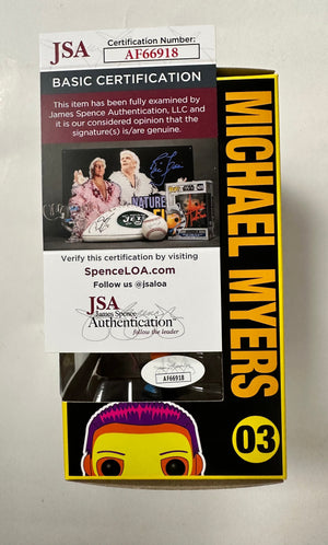 This exclusive James Jude Courtney signed Funko Pop! #03 vinyl figure is a must-have for any Halloween franchise fan. Featuring Michael Myers in a black light design, this Pop! figure is sure to glow and impress. The autograph authentication from James Spence Authentication (JSA) ensures the signature is genuine, making this a valuable addition to any collection.