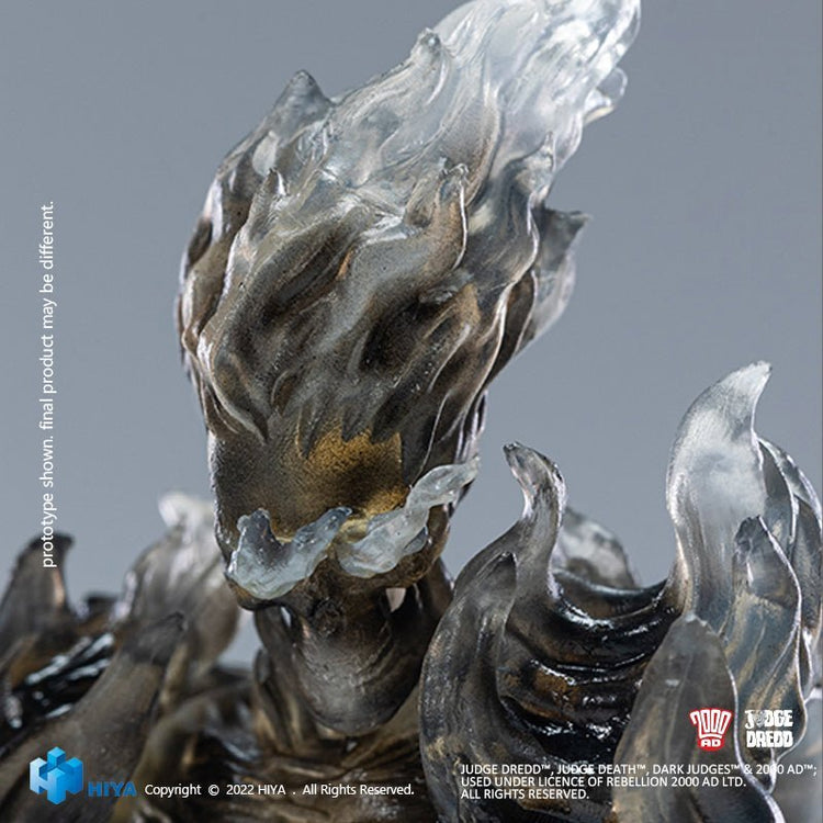From Hiya Toys. A PREVIEWS Exclusive! The latest white hot variant action figure is the black and white Judge Fire! Hiya Toys and Rebellion are proud to announce another of the 1/18-scale PVC action figures in the eagerly anticipated range based on the world of Judge Dredd. Final member of the Dark Judges, Judge Fire is Clothed in eerie, lethal flames and carries his lethal trident, Fire brings death and destruction everywhere he goes! This PREVIEWS Exclusive black and white variant of the Judge Fire figure will come with 16 points of articulation, shoulder and joint pads, chain and badge of office, utility belt, and his mighty flaming trident.