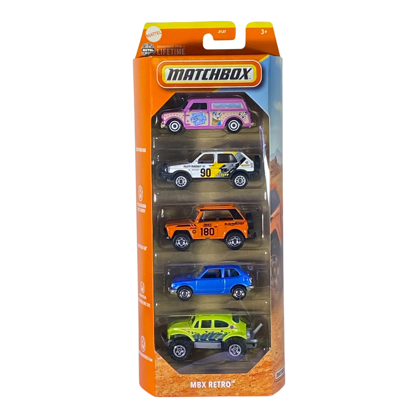 Discover the exciting Matchbox MBX Retro 5-Pack, a must-have multipack featuring five classic diecast vehicles in authentic 1:64 scale. This themed collection revives retro favorites with vibrant liveries and detailed designs, including the iconic Austin Mini Van, the adventurous '90 Volkswagen Golf Country, the rugged MBX Field Car, the nostalgic 1976 Honda CVCC, and the unique Volkswagen Beetle 4x4. Perfect for collectors, kids' play, or display, these vehicles boast realistic details like smoke-tinted windows, chrome accents, and themed graphics that celebrate vintage automotive styles. Brand new in blister packaging, manufactured by Mattel (often Thailand production), this pack is ideal for building your Matchbox collection or gifting to enthusiasts. Capture the essence of retro diecast fun with this highly sought-after set from recent Matchbox releases!