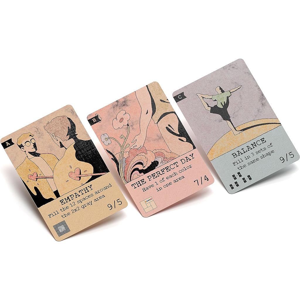 Each emotion is represented by a polyomino shape. Five of the possible Seventeen emotion cards will be available each round, and five rolled dice will determine which colors can be used to add those shapes to a Brain Board.