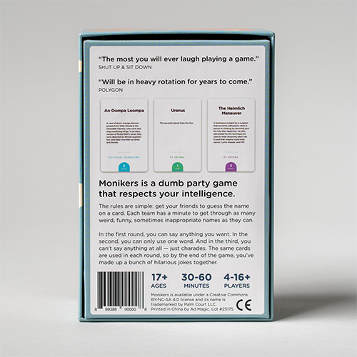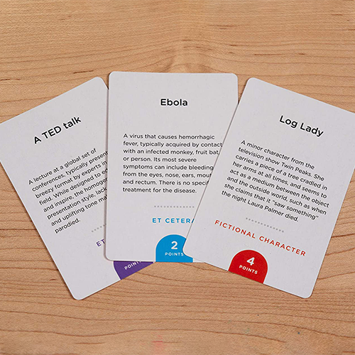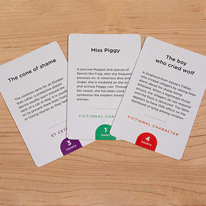 A party game in 3 phases. At the start of the game, you will receive a set of cards featuring names of famous and historical people. You goal is got get your team to guess as many names as possible in the allotted time.