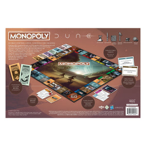Experience life's mysteries through one of the greatest tales of contemporary sci-fi with the ultimate game for Dune fans! MONOPOLY®: Dune lets players buy, sell, and trade influence with characters of different factions from the epic franchise, such as Paul, Emperor Shaddam, Princess Irulan and more. Travel the board with custom tokens based on items from the film, including a Hunter Seeker and Gom Jabbar. Outlast the consequences of Fate and Politics to be the last seeker of the spice standing to win!