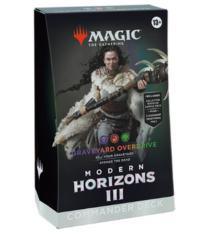 Join Disa, an explorer from Dominaria’s Ice Age, and crush your foes in epic multiplayer battles with a Black-Red Green deck that’s ready to play right out of the box. The Modern Horizons 3 Graveyard Overdrive Commander Deck includes 1 deck of 100 Magic cards (2 Traditional Foil Legendary cards, 98 nonfoil cards), a 2-card Collector Booster Sample Pack (contains 1 Traditional Foil or nonfoil alt-frame card of rarity Rare or higher and 1 Traditional Foil alt-frame Common or Uncommon card), 1 foil-etched Display Commander (a thick cardstock copy of the commander card with foil etched into the card’s border and art), 10 double-sided tokens, 1 deck box (can hold 100 sleeved cards), 1 Life Wheel, 1 strategy insert, and 1 reference card.