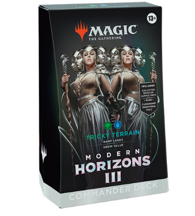 Join Omo, Queen of Vesuva, and maximize every Land you play for killer value with a Green-Blue deck that’s ready to play right out of the box. The Modern Horizons 3 Tricky Terrain Commander Deck includes 1 deck of 100 Magic cards (2 Traditional Foil Legendary cards, 98 nonfoil cards), a 2-card Collector Booster Sample Pack (contains 1 Traditional Foil or nonfoil alt-frame card of rarity Rare or higher and 1 Traditional Foil alt-frame Common or Uncommon card), 1 foil-etched Display Commander (a thick cardstock copy of the commander card with foil etched into the card’s border and art), 10 double-sided tokens, 1 deck box (can hold 100 sleeved cards), 1 Life Wheel, 1 strategy insert, and 1 reference card.