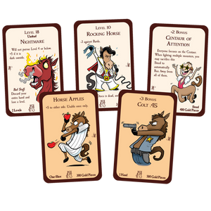 In Munchkin Pony Excess, you'll find new equine monsters, curses, and Items, plus a herd of new Steeds. Grab your Lucky Horseshoe, saddle up your Centaur of Attention, and ride to battle against the melodious menace of the Rocking Horse!