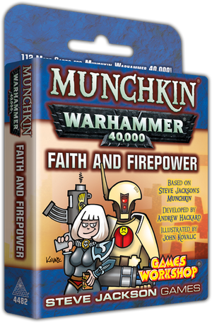 Expand your battles with Munchkin Warhammer 40,000: Faith and Firepower! This 112-card set includes two new armies for Munchkin Warhammer 40,000. The Sisters of Battle are some of the most elite Imperial soldiers around, and the T'au make terrifying enemies...or stalwart allies in the war against Chaos. Plus lots of new loot and horrible monsters to fight!