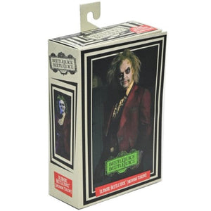 From NECA. A return to NECA's Cult Classics line, featuring your favorite heroes and villains from classic horror, sci-fi, and action movies! NECA is bringing back the beloved 7-inch scale Beetlejuice action figure from the original 1988 Tim Burton movie starring Michael Keaton. This obnoxious freelance "bio-exorcist" is hired to scare away the living but is secretly scheming his way back to life. Wearing Beetlejuice's red tuxedo from the iconic wedding scene, this highly detailed figure features 8 points of articulation and includes snake and Handbook for the Recently Deceased accessories. Comes in classic cardback packaging.