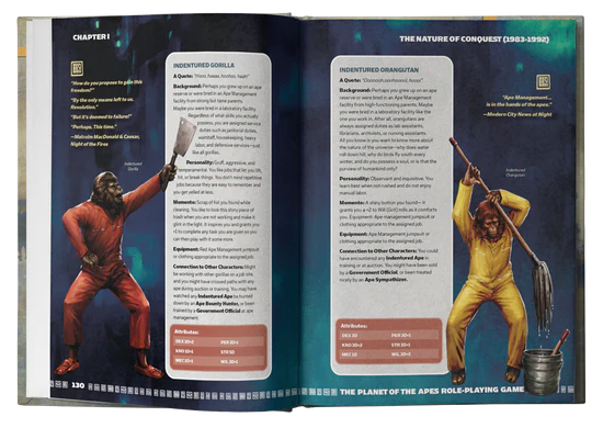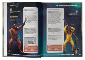 movies to your tabletop game. Now you can interact with apes and humans direct from the silver screen — Caesar, Taylor, Zira, Hasslein, and, of course, Dr. Zaius — every iconic character is gamified for campaign use with biographies and statistics. This sourcebook showcases a detailed chronology of the distinctly different timelines that arose out of choices made by both human and ape alike.