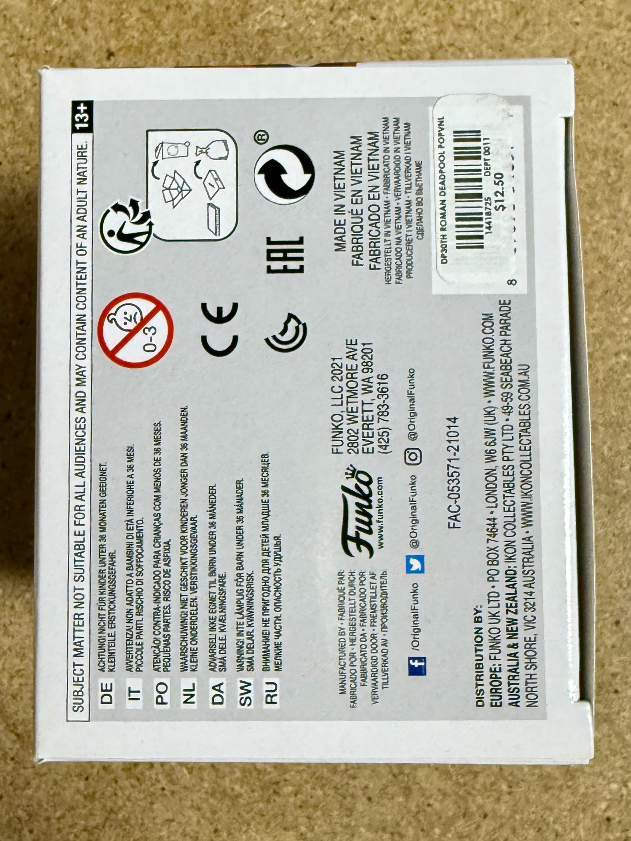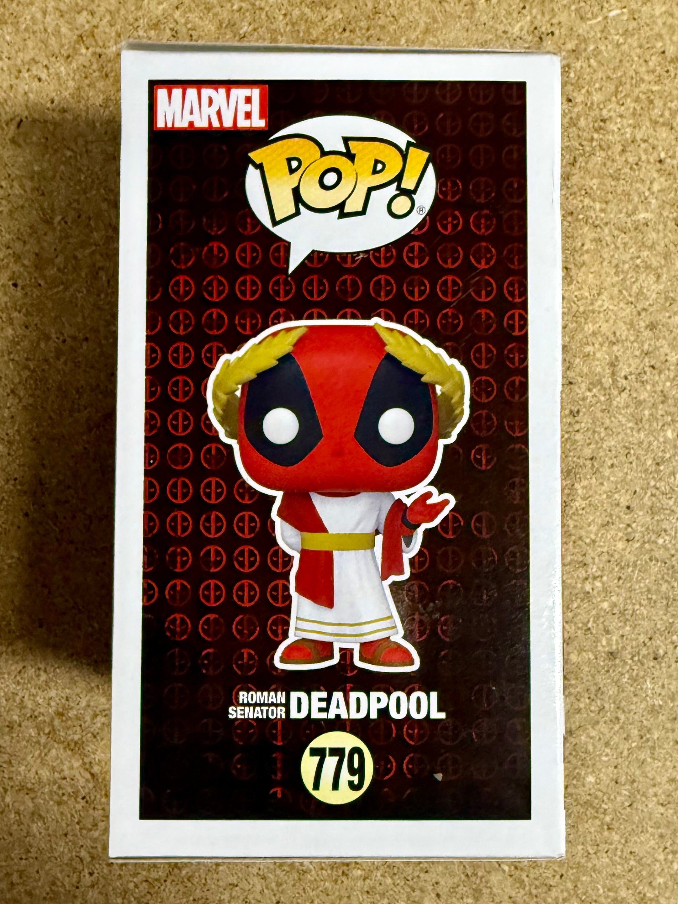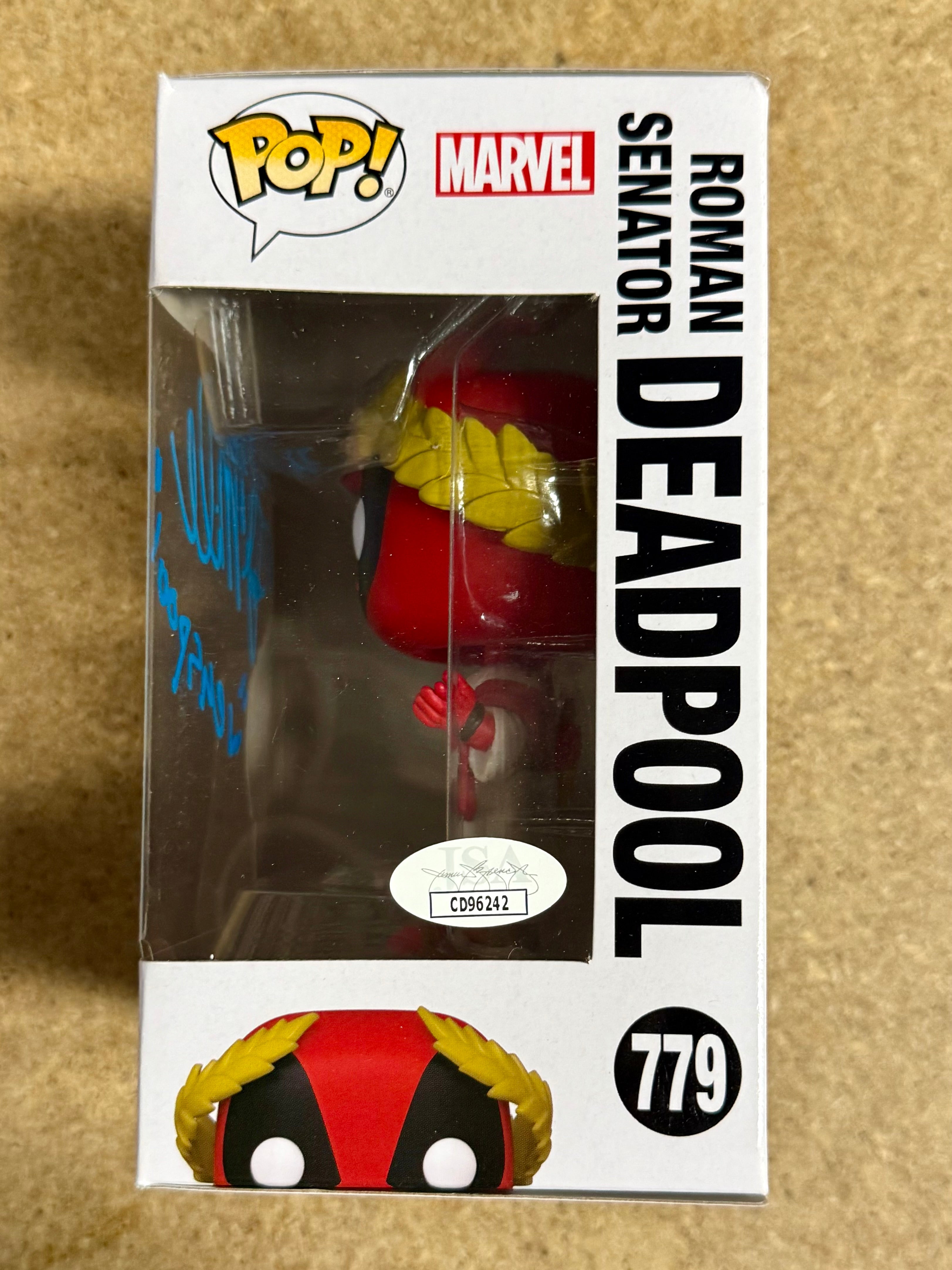 The product is a signed TJ Miller Roman Senator Deadpool Funko Pop #779 from the Marvel Universe. This vinyl figure features the character of Deadpool and comes with a JSA COA for autograph authentication. TJ Miller Played Weasel in the Deadpool movies 1 & 2.