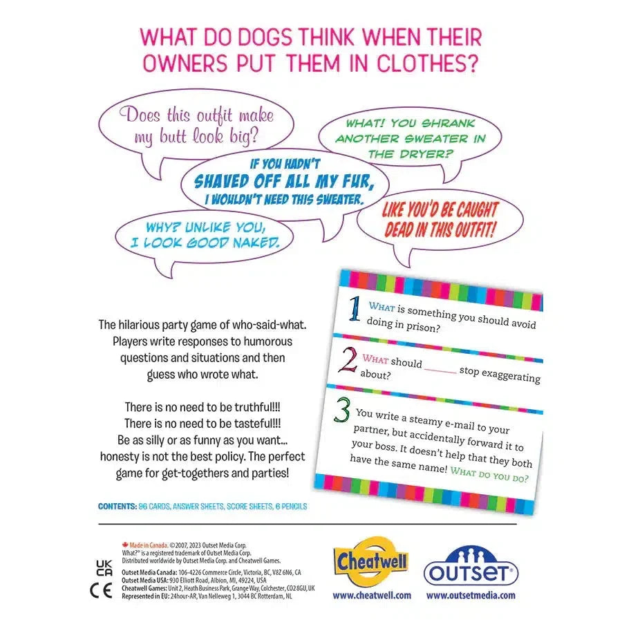 Same great game, different packaging. Party game, What?®, is the perfect party game for large groups. Easy to play rules get people quickly guessing, who-said-what, as responses to questions are read out loud. It's also the perfect house warming gift for humorous humans!