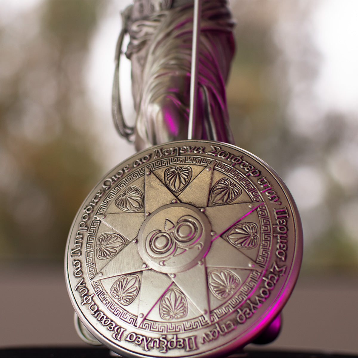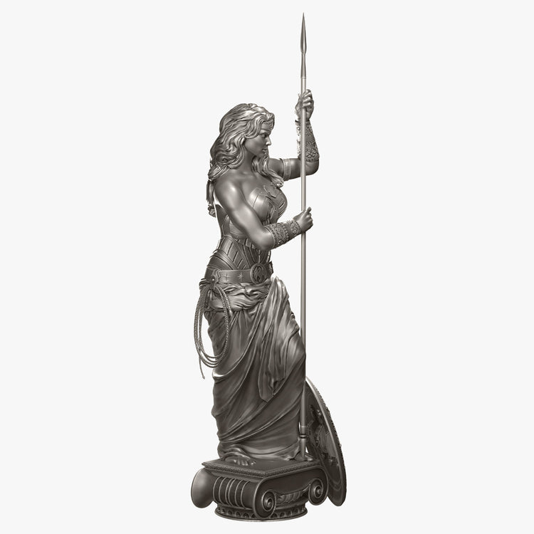 Inspired by the character's ties to Greek mythology, the statue reimagines the character as a classical Greek sculpture. Paying homage to the famous Venus de Milo, the polyresin statue measures 14 inches from the base of the plinth to the top of the spear and features versions of the Super Hero's iconic bracelets, lasso, and other accessories. The spear is removable and the rim of the shield is inscribed with Wonder Woman's classic epithet in Greek lettering: “Beautiful as Aphrodite, wise as Athena, swifter than Hermes, and stronger than Hercules.”